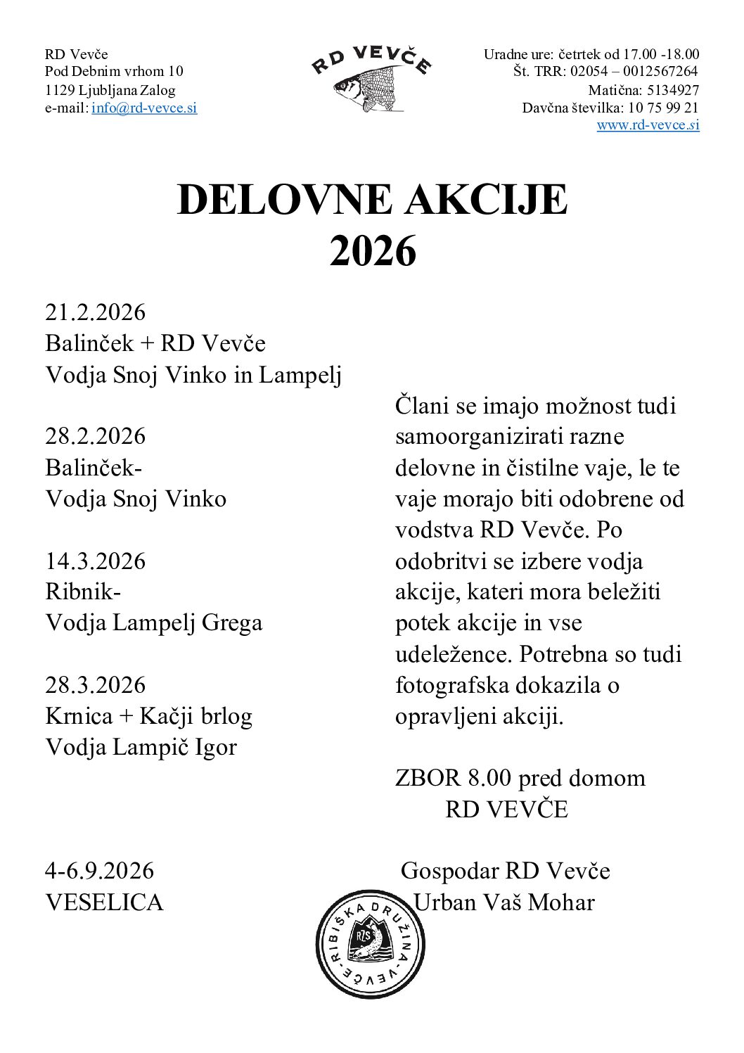 Spoštovani! UO Vam posreduje načrtovane delovne akcije za leto 2026. Zbor za delovne akcije je pred RD Vevče ob 8.00 uri. Povezava za delovne akcije: Delovne akcije 2026 Lep pozdrav UO
