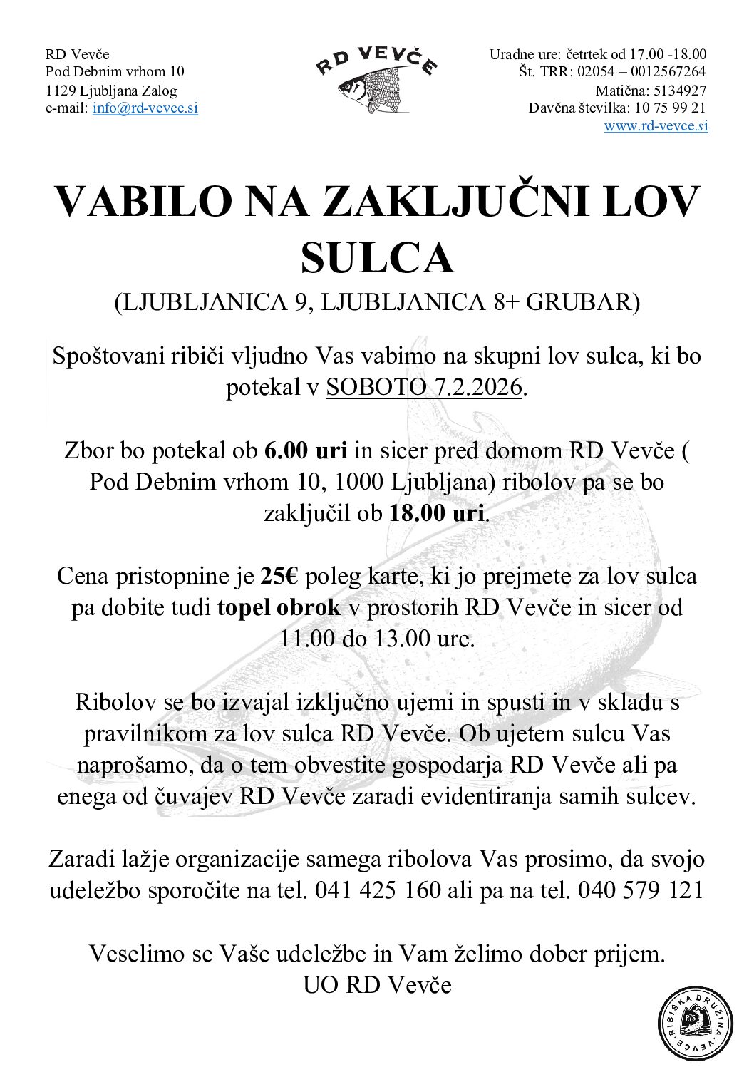 Spštovani obiskovlaci RD Vevče Vljudno Vas vabimo na skupni ribolov sulca, ki bo potekal 7.2.2026 in sicer ob 6.00 uri ob ribolovu bodo udeleenci dobili tudi topel obrok, vse ostale podatke o ribolovu najdete na spodnji povezavi. POVEZAVA: Skupni-robolov-sulca 7.2.2026 Veselimo se skupnega druženja in dober prijem Gospodar RD Vevče Urban Vaš […]